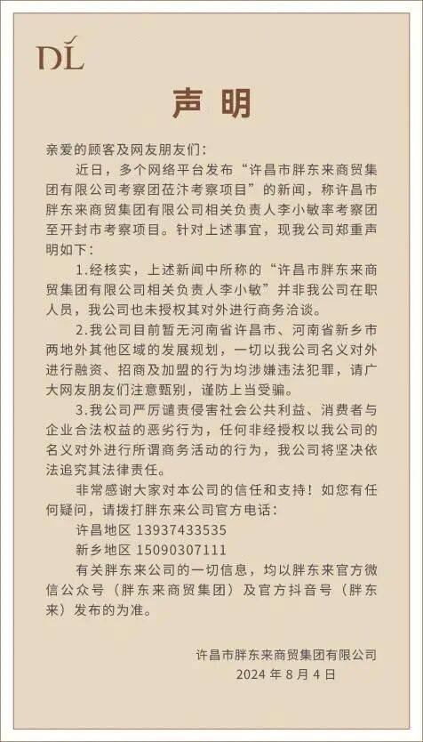 据了解,胖东来已于2024年公开发布声明,明确企业发展布局,相关信息以公告内容为准。