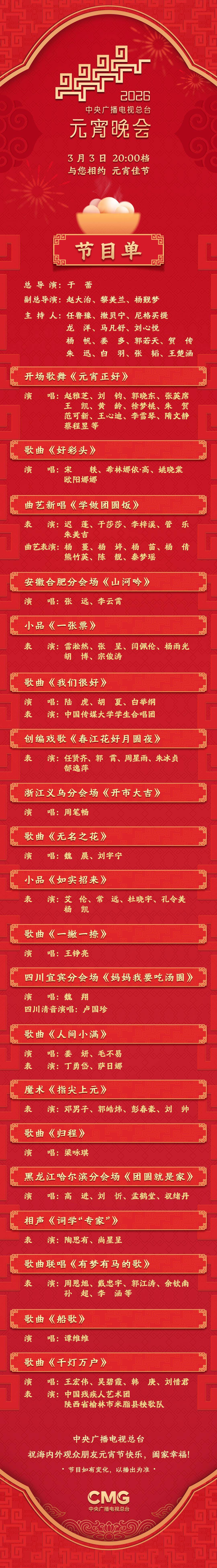 节目单来了!中央广播电视总台《2026年元宵晚会》今晚播出