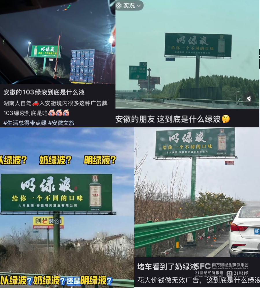 由于广告中品牌名三个字写法飘逸,堵在高速上的游客们脑洞大开:奶绿波?以绿波?旺绿波?明缘液?103绿液? 相关发帖在抖音、小红书、视频号持续引起讨论,猜对这三个字成了春运期间自驾游客的乐趣之一。