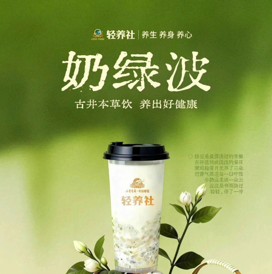 股东方古井贡酒旗下的古井轻养社也随后宣布推出“奶绿波”奶茶产品,开始在亳州轻养社线下门店销售,这款产品加入了绿豆——后者正是明绿液的核心原料。
