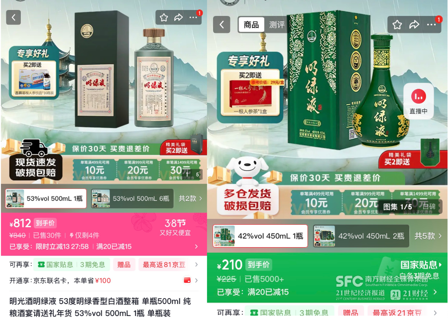 明绿液是安徽少有的千元价格带高端白酒,21世纪经济报道记者查询发现,明光酒业官方电商旗舰店“53度明绿液”单瓶售价超过800,比肩一线高端白酒,而其销量最好的主力产品42度“明绿液普绿”,则是在200多元,处于中端价位。