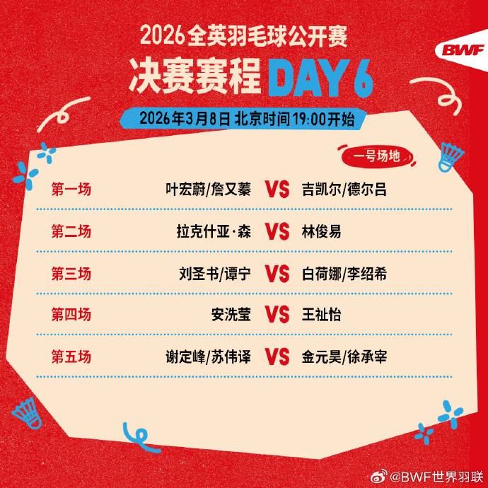 今天(3月8日),2026全英羽毛球公开赛进入第6个比赛日,晚上七点起将进行多项决赛。其中:
