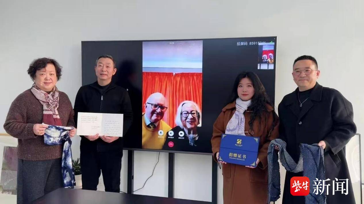 于是,这条漂泊了近40年的围巾,带着两代人的手温,从英国回到了南通故土。在3月6日的捐赠现场,大屏幕上,远在英国的倪百瑞夫妇通过视频连线,亲眼见证了围巾“落户”南通华艺非遗扎染博物馆。“这是一段美好的缘分,不仅存在于两地的人们之中,也维系这份联结与友谊,是如此重要。”倪百瑞通过视频发出感慨。
