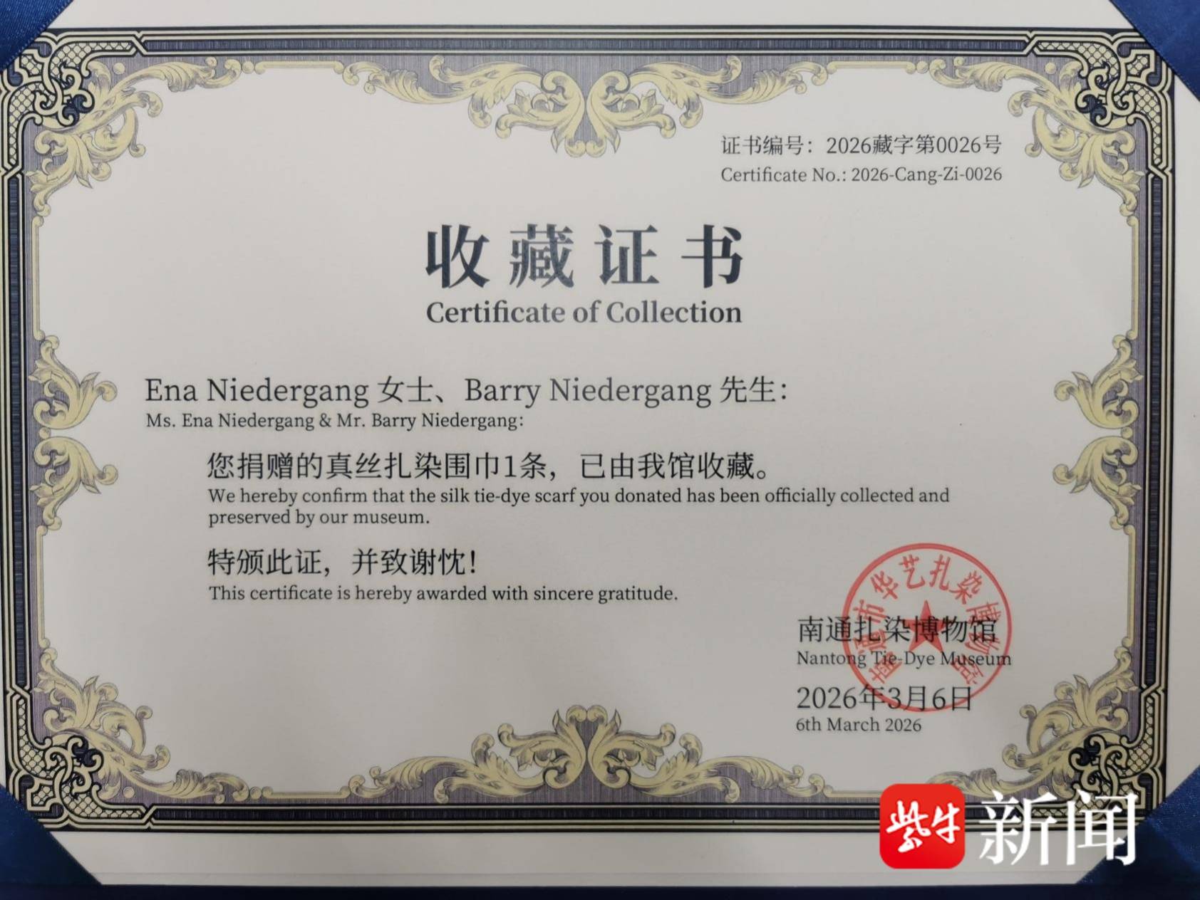 漂洋过海的友谊信物:英国夫妇将40年前获赠的扎染围巾回赠南通