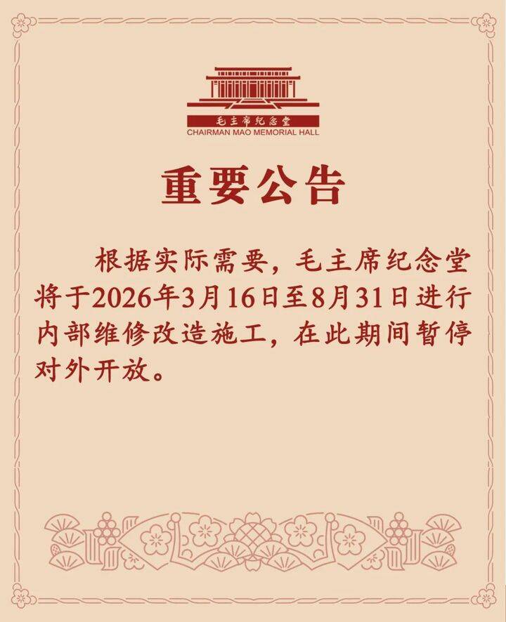 3月16日至8月31日,毛主席纪念堂暂停开放