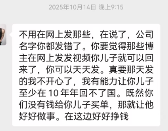 郑女士说,控制姚富军的人威胁他们,如果不拿钱,就让姚富军10年回不了国,甚至让他们永远联系不到姚富军。他们全家现在非常着急,希望孩子能早日获得自由。扬子晚报/紫牛新闻记者 宋世锋