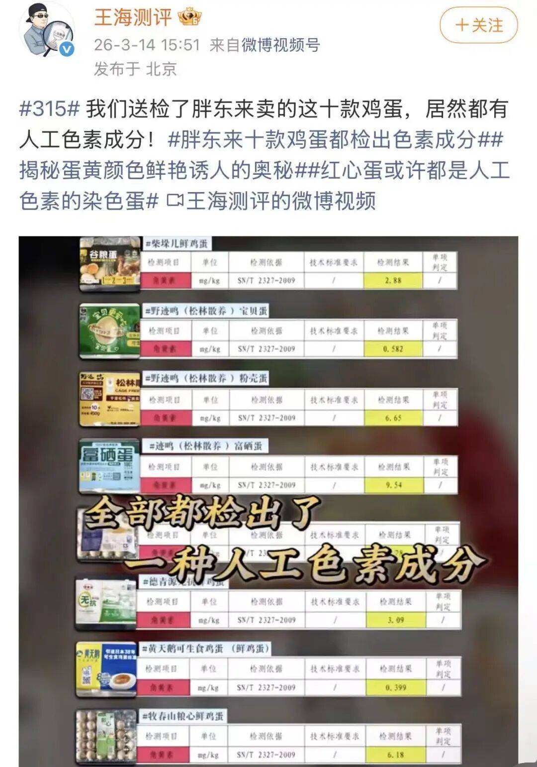 3月13日,知名打假人王海团队公开爆料称,送检了胖东来卖的十款鸡蛋,均检出人工角黄素(斑蝥黄),直指品牌涉嫌虚假宣传。