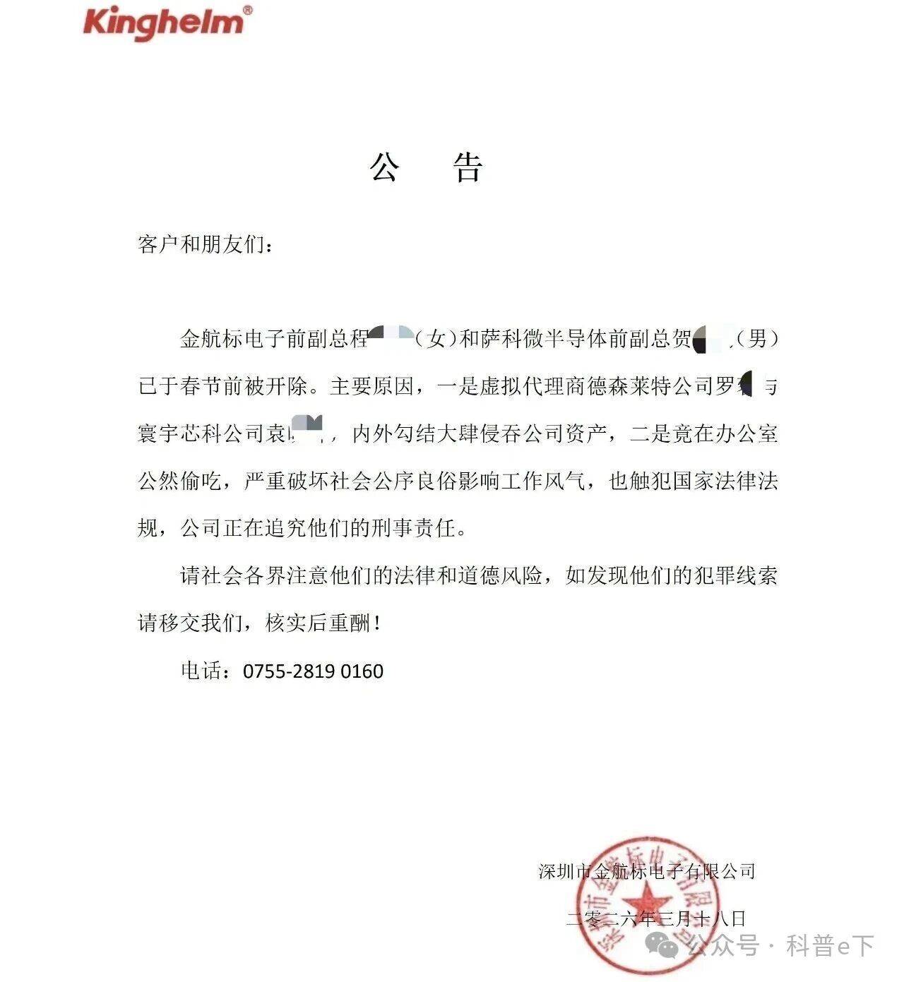 公告内容显示,发送对象是该公司的客户和朋友。公告称:金航标电子前副总程某某(女)和萨科微半导体前副总贺某某(男)已于春节前被开除。主要原因,一是虚拟代理商德森莱特公司罗某与寰宇芯科公司袁某,内外勾结大肆侵吞公司资产,二是竟在办公室公然偷吃,严重破坏社会公序良俗,影响工作风气,也触犯国家法律法规,公司正在追究他们的刑事责任。