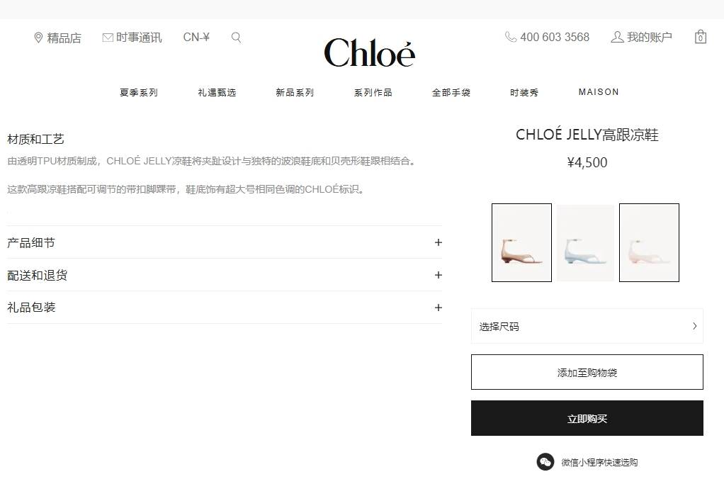 同时,销售人员向记者推荐了已经在线上上架的同系列另一款凉鞋。据官网显示,这款Chloe JELLY高跟凉鞋售价4500元,有浅棕色、绿色和桃粉色可选,鞋面、内底、鞋底为TPU材质,鞋跟材质为聚碳酸酯树脂。