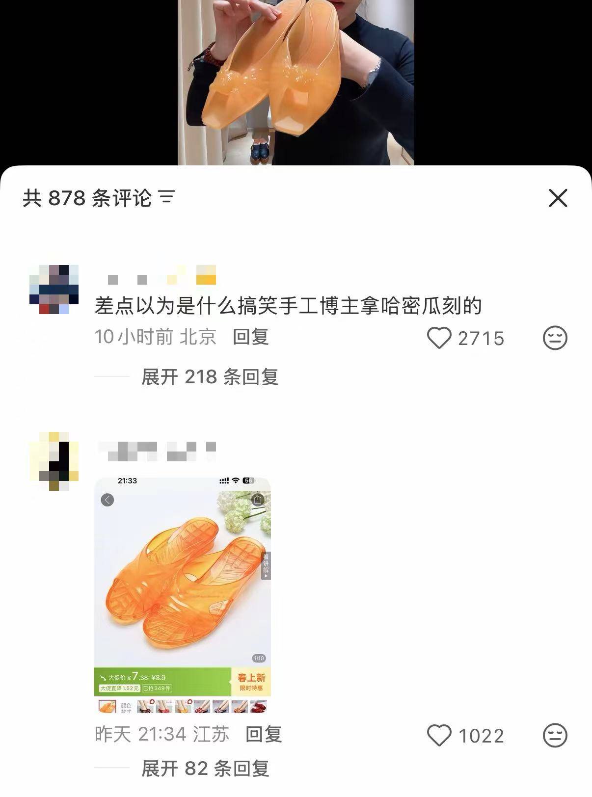 由于视频里凉鞋的橘色色调较为鲜艳,不少网友纷纷评论:“差点以为是什么搞笑手工博主拿哈密瓜刻的!”“这不是小时候穿的塑料凉鞋吗?”“还以为捧了两条三文鱼……”“同款蓝色还挺好看的!”