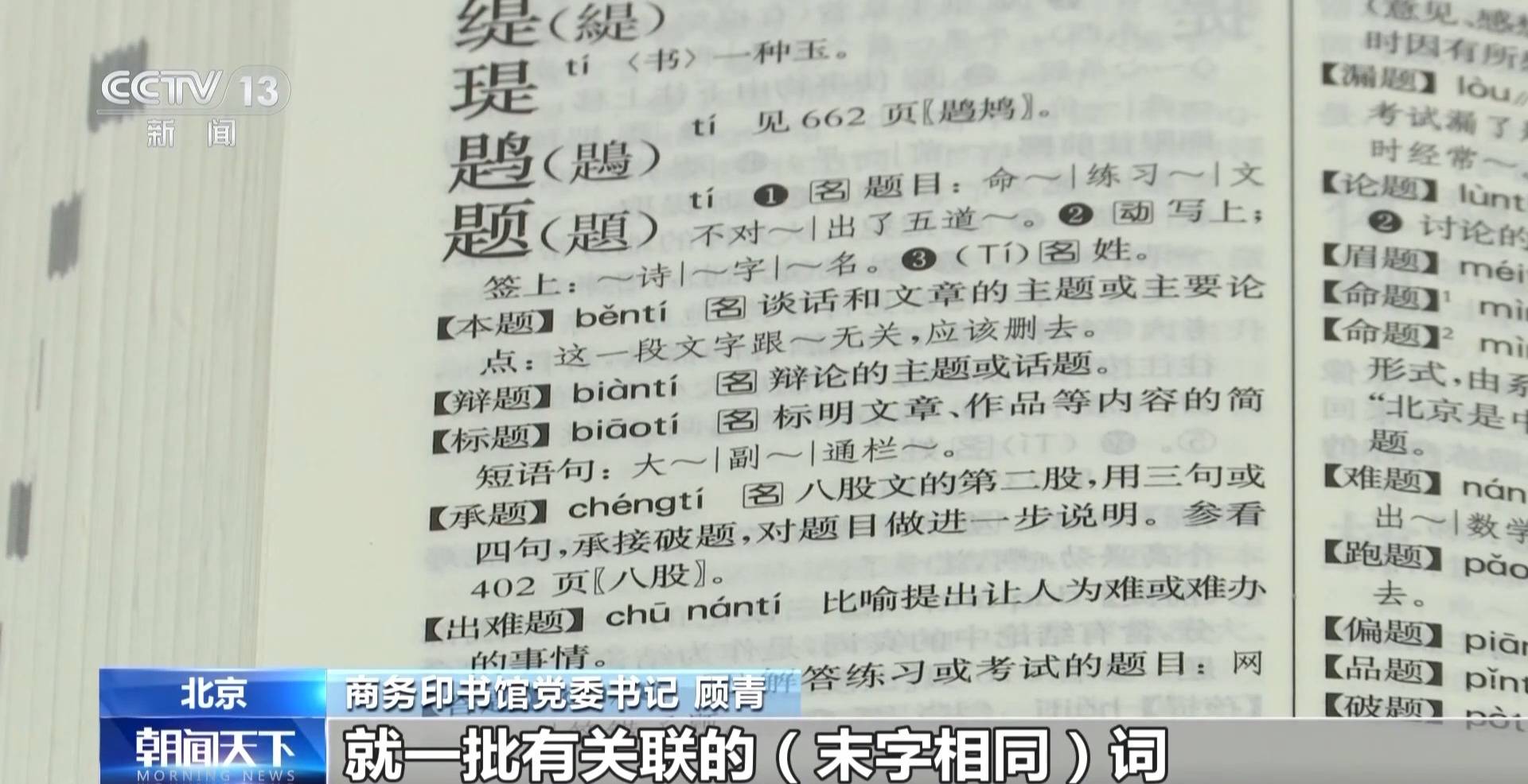 商务印书馆党委书记 顾青:正序是拿一个词的正字头来进行认识,倒序是拿尾字来做认识,这在语言学上称之为词群,一批有关联的末字相同词搁在一起了。