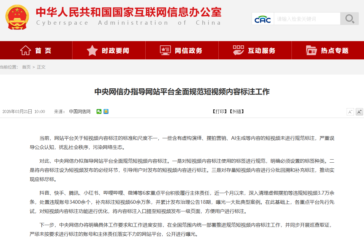 中央网信办指导网站平台全面规范短视频内容标注工作 详情