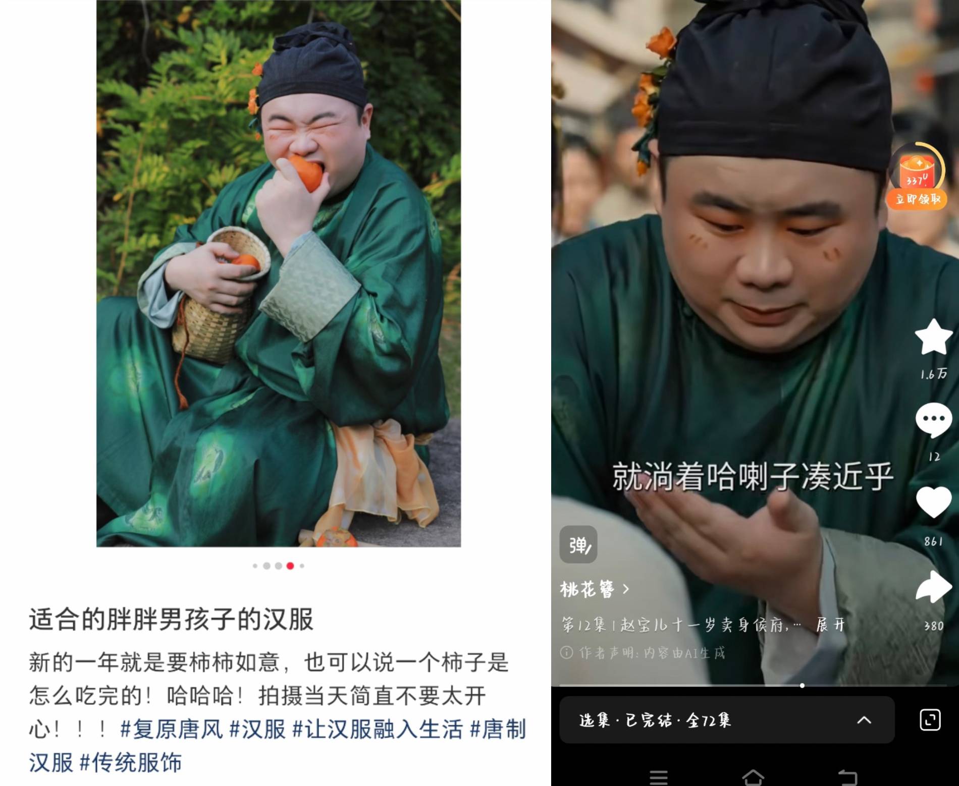 该网友在帖文中晒出对比图称,剧中角色的外貌、身形、服装造型与其此前的汉服妆造高度相似,头饰、妆容也基本一致。剧中台词对涉事角色的形象描述为:“他身材短小粗胖,平日里游手好闲还好色,看见个女的,眼珠子就黏在了人家身上,浑身上下透着龌龊。可就这么个狗嫌人厌的男人,在何掌柜眼里竟成了天仙……”