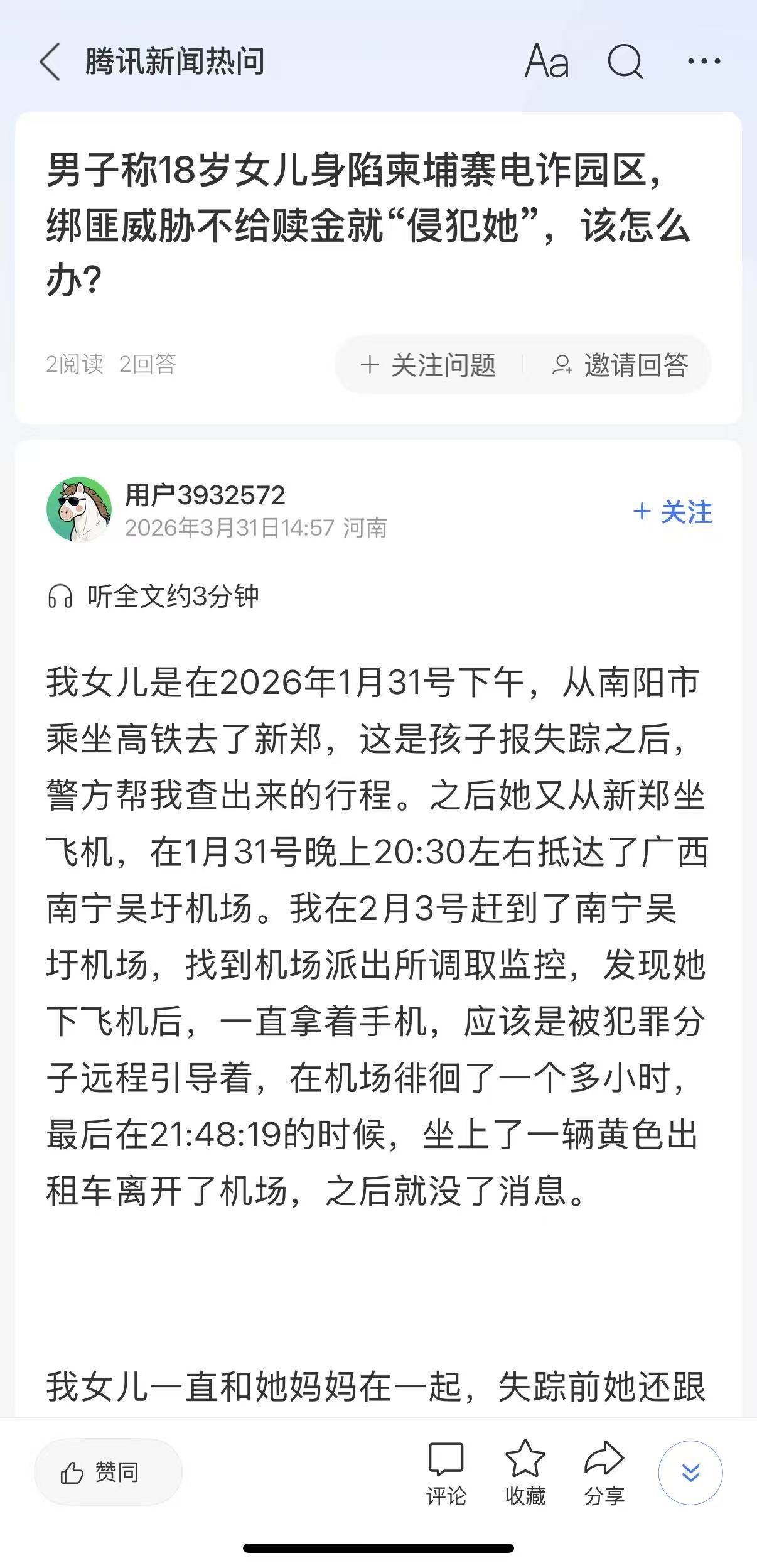 河南南阳的仝先生在腾讯热问发帖求助,称女儿景景1月底突然失联,经多方排查确定其身处柬埔寨电诈园区。控制景景的人多次向他索要赎金,还在视频通话中殴打景景,并威胁要找人对她实施“轮奸”。仝先生卖掉汽车、多方凑钱,先后两次支付赎金,总额达十多万元,但对方始终未放人。3月31日下午,南阳公安局车站分局正式对景景失踪案进行立案侦查,但由于涉及跨国调查,案件调查难度极大。仝先生心急如焚,希望能早日救出女儿。