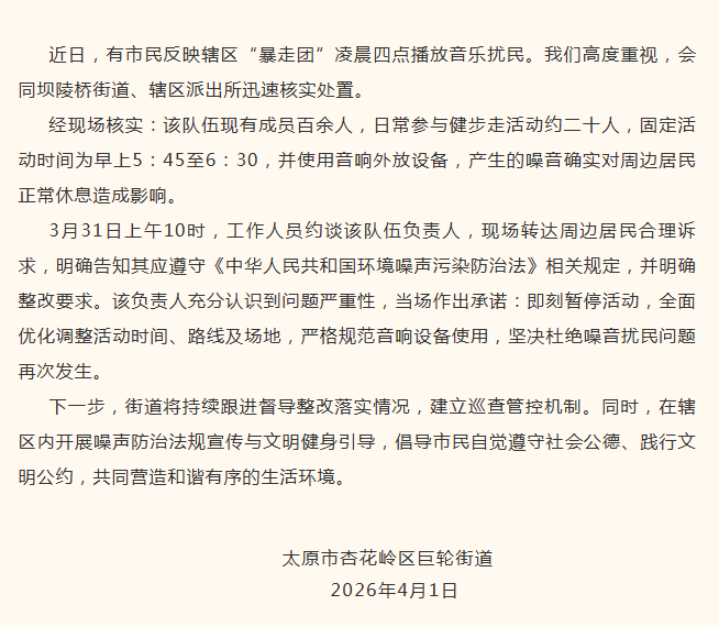 紫牛新闻记者注意到,就在今天(4月1日)下午,太原市杏花岭区巨轮街道对此予以了正式回应。“近日,有市民反映辖区‘暴走团’凌晨四点播放音乐扰民。我们高度重视,会同坝陵桥街道、辖区派出所迅速核实处置。”街道方面称,经现场核实:该队伍现有成员百余人,日常参与健步走活动约二十人,固定活动时间为早上5:45至6:30,并使用音响外放设备,产生的噪音确实对周边居民正常休息造成影响。3月31日上午10时,工作人员约谈该队伍负责人,现场转达周边居民合理诉求,明确告知其应遵守《中华人民共和国环境噪声污染防治法》相关规定,并明确整改要求。