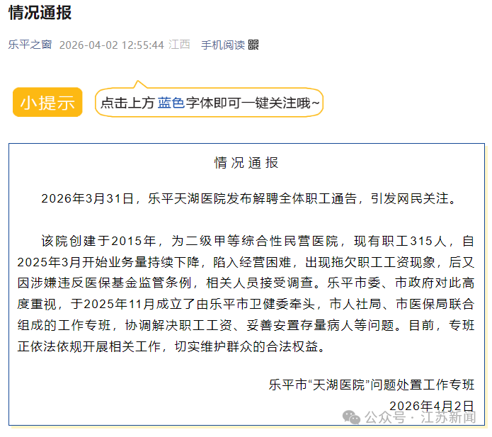 3月31日,乐平天湖医院发布解聘全体职工通告,引发网民关注。