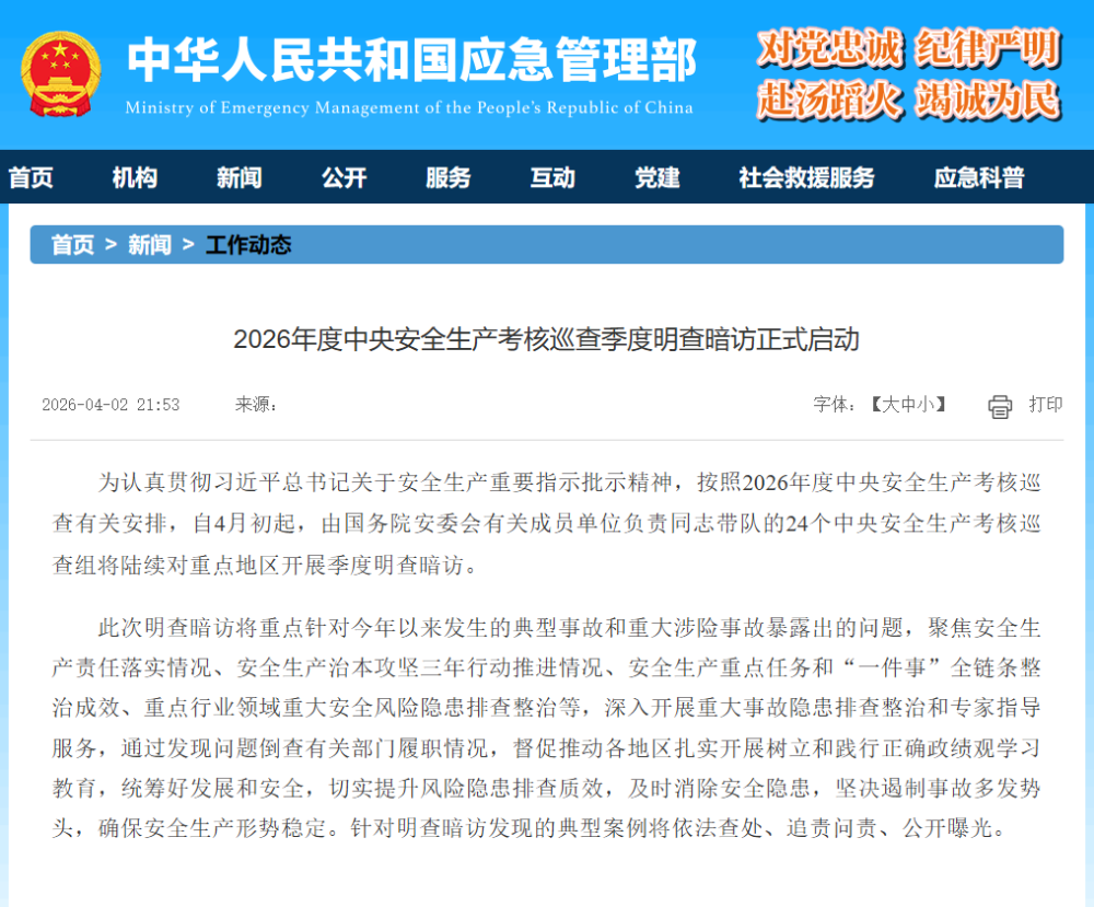 为认真贯彻习近平总书记关于安全生产重要指示批示精神,按照2026年度中央安全生产考核巡查有关安排,自4月初起,由国务院安委会有关成员单位负责同志带队的24个中央安全生产考核巡查组将陆续对重点地区开展季度明查暗访。