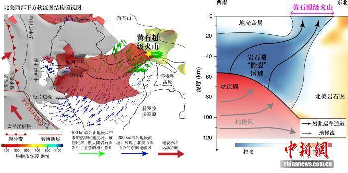该模型预测,位于北美中东部下地幔的古老法拉龙板块的持续下沉,驱动了北美西部的软流圈快速向东漂移,而该东向流动的软流圈在穿过黄石火山下方狭窄的大陆岩石圈通道时,由于上升的热物质与下潜的地幔流之间相互拉扯,导致减压熔融,产生大量幔源岩浆。