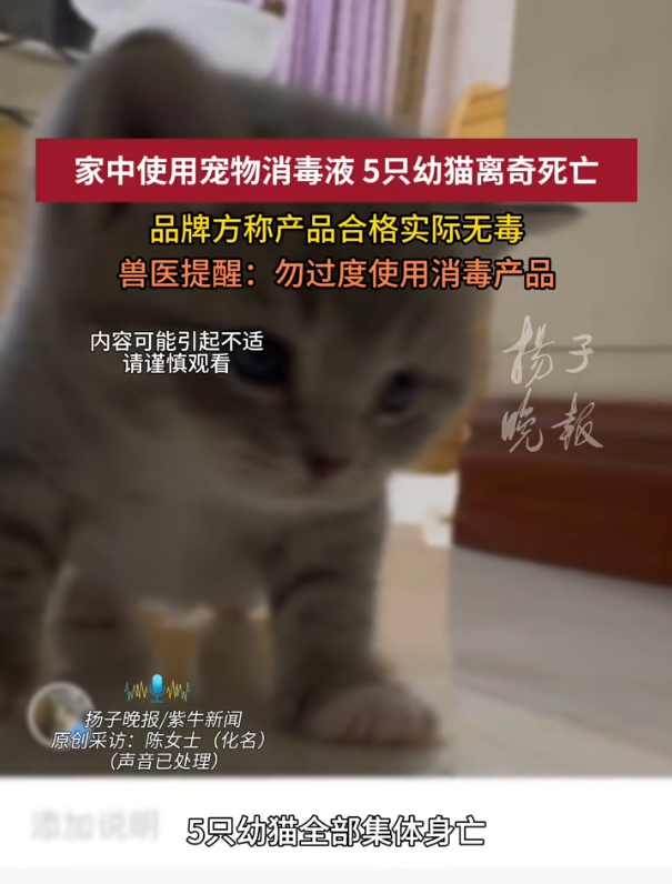 5只幼猫死亡,猫主疑和宠物专用消毒液有关,品牌方称产品合格实际无毒    详情