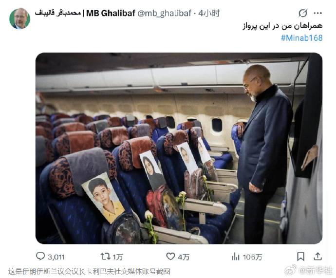 伊朗首席谈判代表、伊朗议会议长卡利巴夫当天在自己的社交媒体账号发了一张让人动容的照片,配文“我的飞行同伴们”。