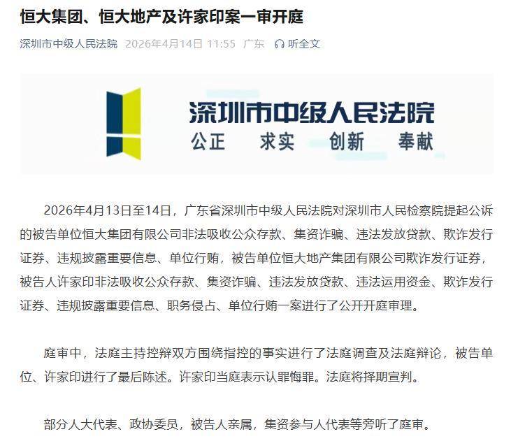 2026年4月13日至14日,广东省深圳市中级人民法院对深圳市人民检察院提起公诉的被告单位恒大集团有限公司非法吸收公众存款、集资诈骗、违法发放贷款、欺诈发行证券、违规披露重要信息、单位行贿,被告单位恒大地产集团有限公司欺诈发行证券,被告人许家印非法吸收公众存款、集资诈骗、违法发放贷款、违法运用资金、欺诈发行证券、违规披露重要信息、职务侵占、单位行贿一案进行了公开开庭审理。