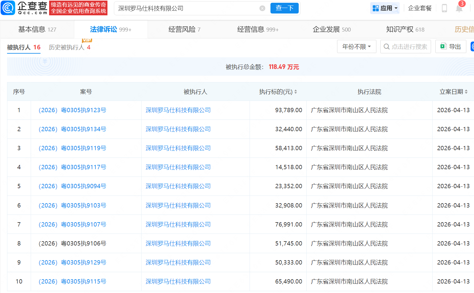 近日,扬子晚报/紫牛新闻记者从企查查获悉,深圳罗马仕科技有限公司新增16条被执行人信息,被执行总金额118.49万元,执行法院为广东省深圳市南山区人民法院。