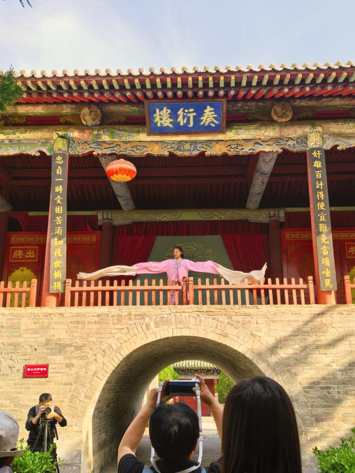 戏台面阔七间,横向一字排开,正对着三大殿。据河东池盐博物馆讲解员岳博文介绍,每年逢二月初一产盐开工和八月十五产盐结束,当时的盐官、盐商会请戏班演戏酬神,而且是同一时间、同一地点,一下唱三出戏,祈求神灵护佑、感谢神灵赐福。这种元代戏台“连三对唱”的形制,全国仅存此一处。