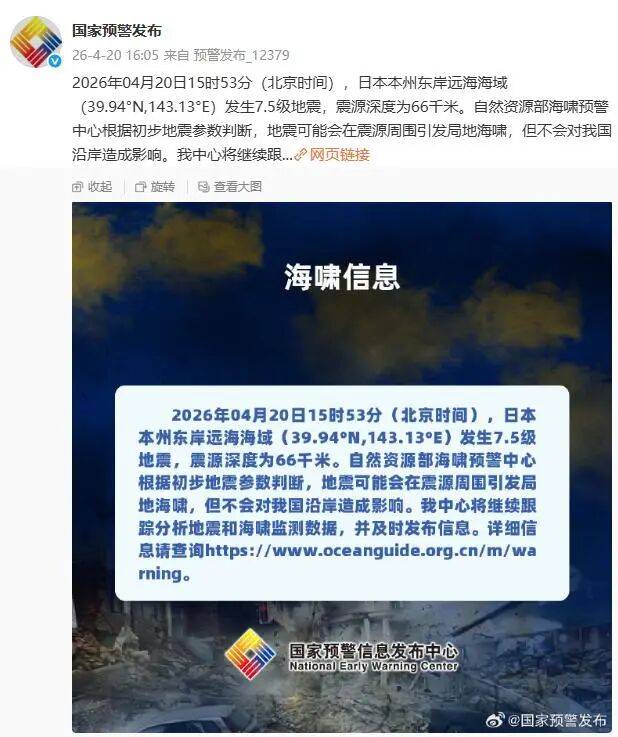 2026年04月20日15时53分(北京时间),日本本州东岸远海海域(39.94°N,143.13°E)发生7.5级地震,震源深度为66千米。自然资源部海啸预警中心根据初步地震参数判断,地震可能会在震源周围引发局地海啸,但不会对我国沿岸造成影响。