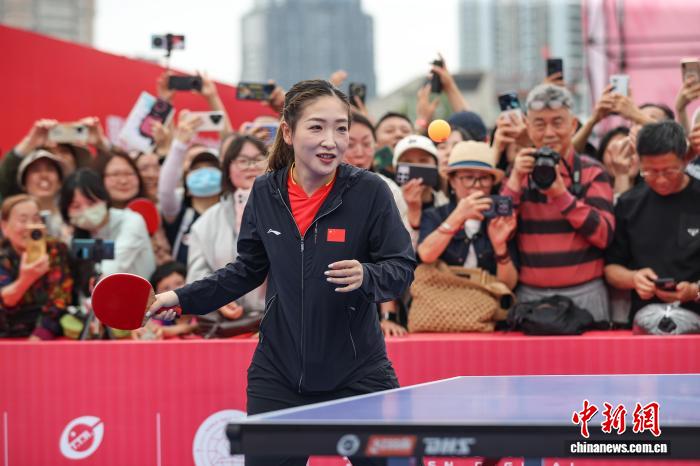 图为刘诗雯在百台千人赛环节中和乒乓球爱好者切磋球技。中新社记者 瞿宏伦 摄