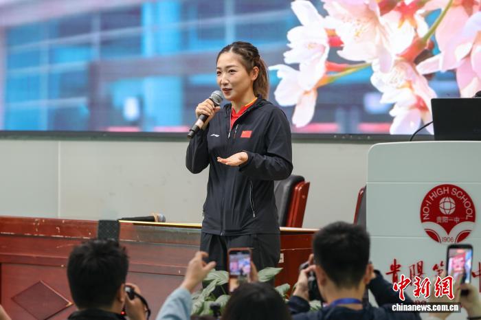 图为刘诗雯在国球进校园环节中和贵阳一中学生交流。中新社记者 瞿宏伦 摄