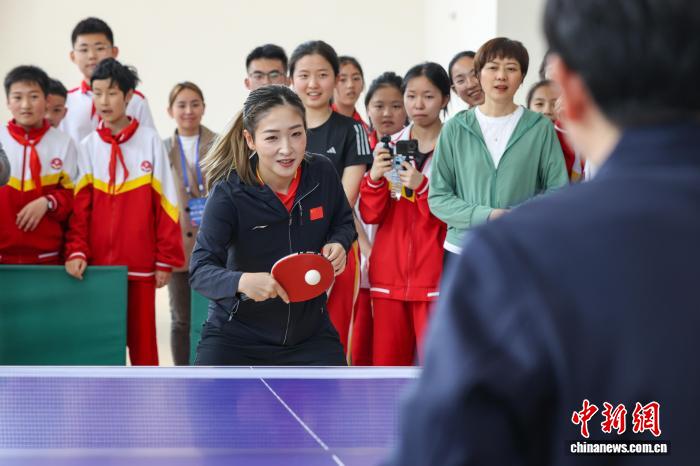 图为刘诗雯在国球进校园环节中和贵阳一中老师切磋球技。中新社记者 瞿宏伦 摄
