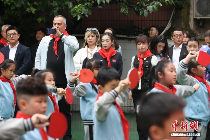 图为刘诗雯等嘉宾(前排左三)在国球进校园环节中观看贵阳市都市路小学乒乓球操。中新社记者 瞿宏伦 摄
