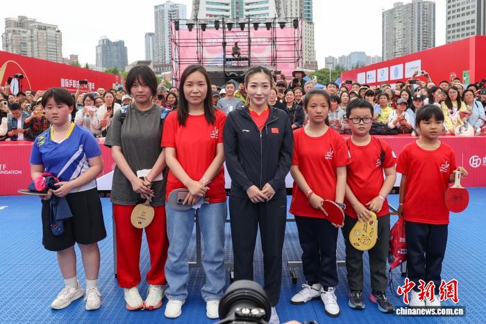 图为刘诗雯(左四)在百台千人赛环节中和乒乓球爱好者合影。中新社记者 瞿宏伦 摄