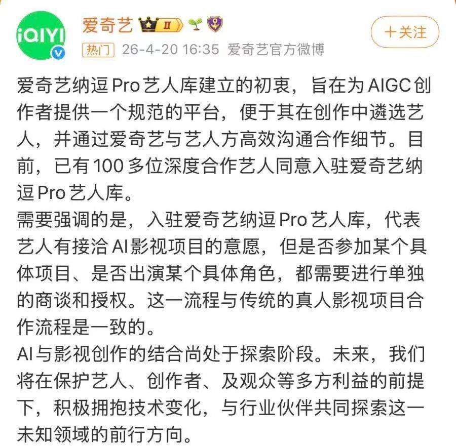 对此,爱奇艺迅速发文回应“AI艺人库”相关争议:
