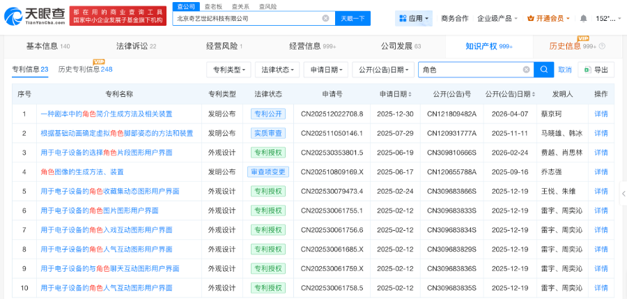据天眼查知识产权信息,爱奇艺关联北京奇艺世纪科技有限公司已申请多个“角色”相关专利,包括“角色图像的生成方法、装置”“根据基础动画确定虚拟角色脚部姿态的方法和装置”等,当前专利法律状态多为已获授权。