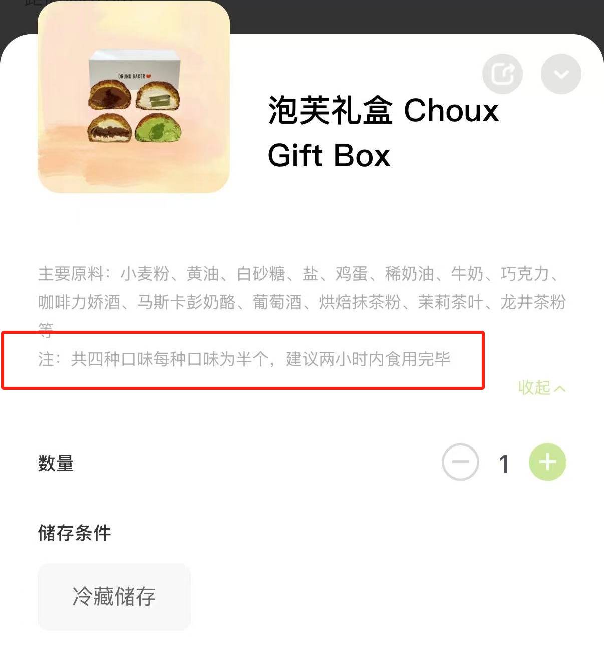 据Drunk Baker官方社交媒体公开信息,消费者提到的这款“泡芙礼盒”,包含抹茶、生巧、茉莉龙井、提拉米苏四种口味。记者在该品牌官方小程序看到,该礼盒售价38元。图片展示有一个包装盒和四款泡芙产品,从图上可以看到泡芙中不同的馅料;产品详情的文字部分介绍了主要原料,点开“展开”选项后,另有一行说明标注:“共四种口味每种口味为半个,建议两小时内食用完毕。”