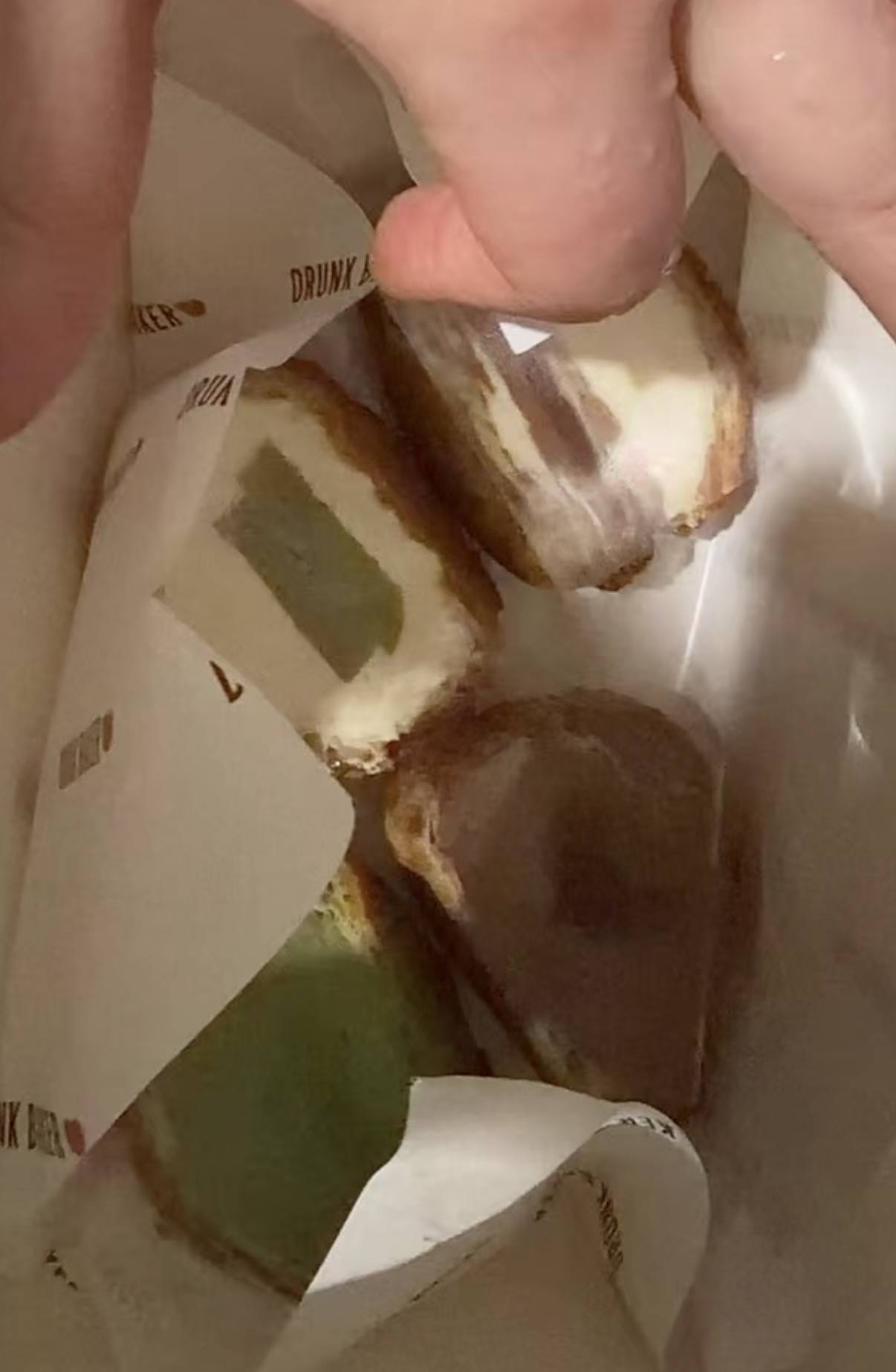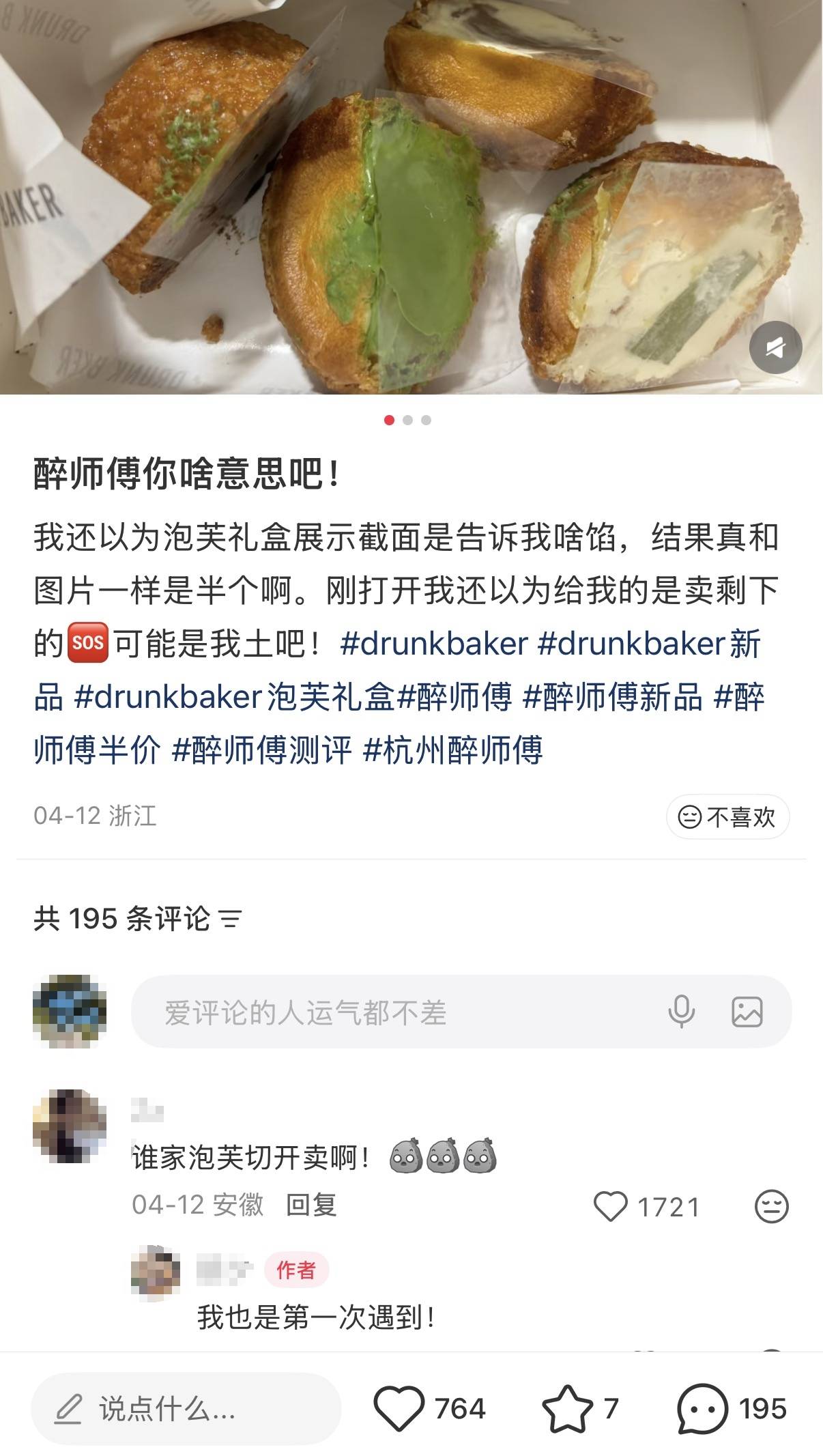 4月20日,南京市民徐女士(化名)告诉扬子晚报/紫牛新闻记者,她此前在该泡芙新品半价优惠时,花19元购买了这款产品。收到后打开发现,馅料都露在外面,她起初以为是每个泡芙都被切开方便食用,仔细查看才发现,是四种口味各半个。“之前也买过Drunk Baker这家的蛋糕,蛋糕的商品图片也会有一个横切面的展示,但是收到都是一整个蛋糕。这次的一盒泡芙拼起来相当于两个完整的,如果按原价38元算,就是38元两个,不太划算。”徐女士说。