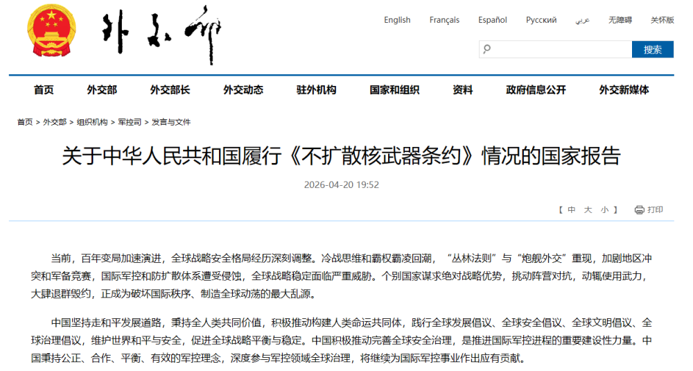 外交部发布关于中华人民共和国履行《不扩散核武器条约》情况的国家报告 详情