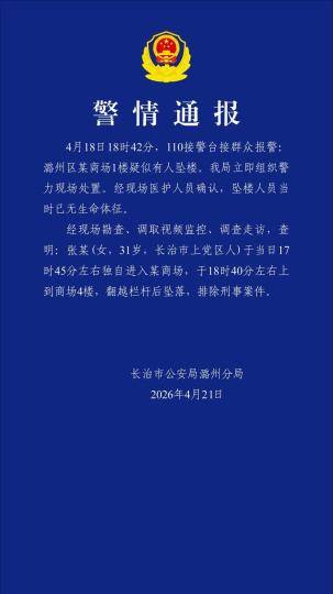 经现场勘查、调取视频监控、调查走访,查明:张某(女,31岁,长治市上党区人)于当日17时45分左右独自进入某商场,于18时40分左右上到商场4楼,翻越栏杆后坠落,排除刑事案件。