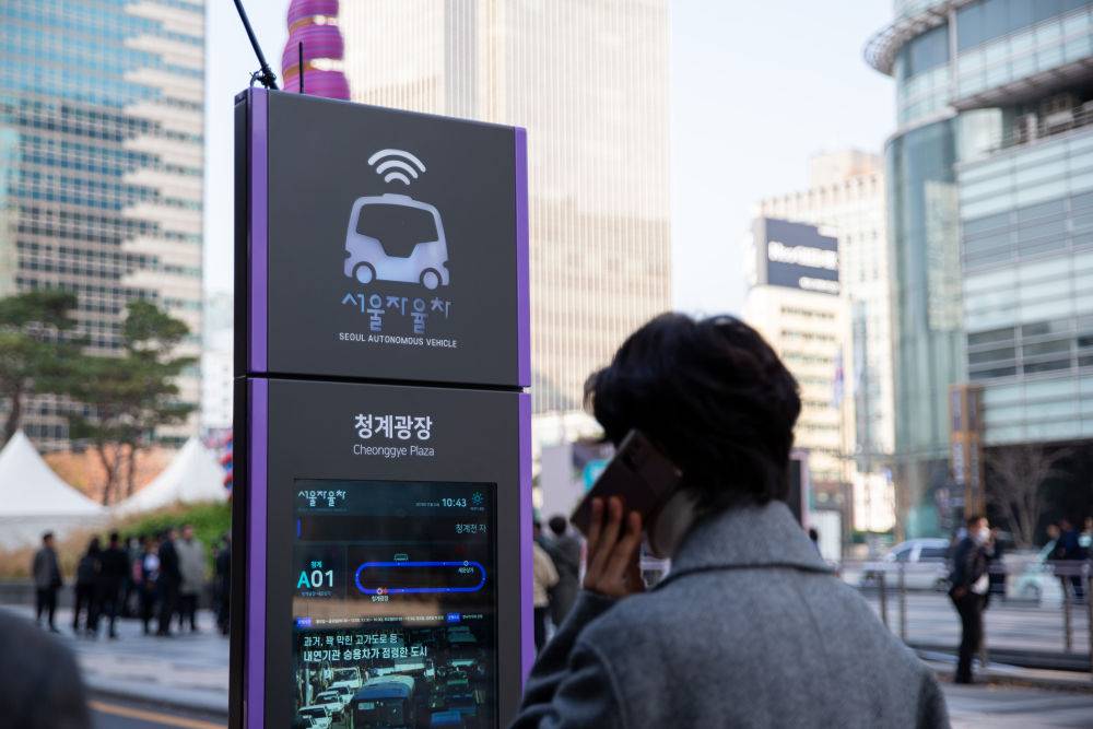 这是2022年11月24日在韩国首尔拍摄的显示巴士实时位置的自动驾驶巴士站牌。新华社记者王益亮摄