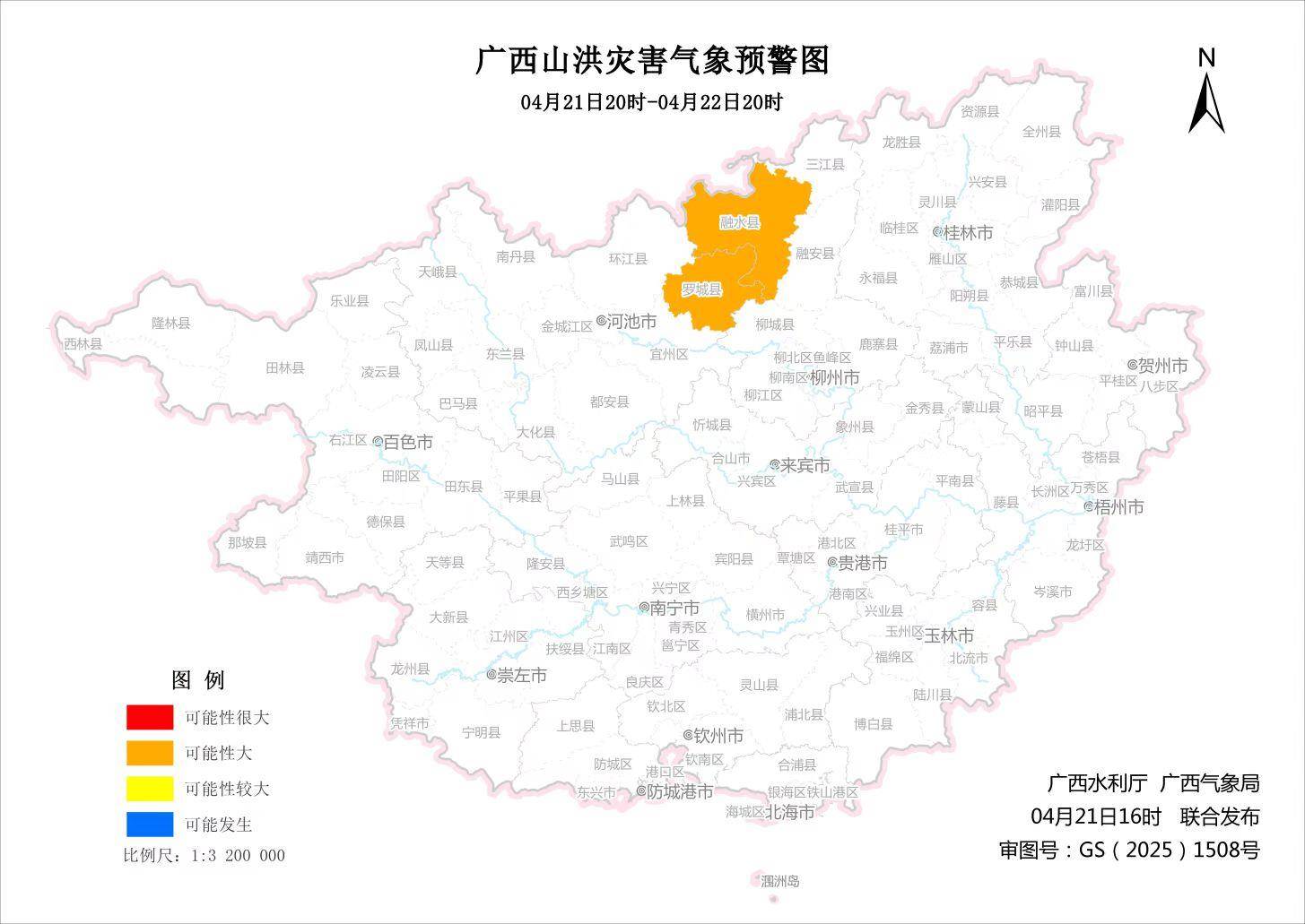 预计,4月21日20时至4月22日20时,柳州市融水苗族自治县、河池市罗城仫佬族自治县发生山洪灾害可能性大(橙色预警)。请各影响区注意做好监测、巡查、预警和转移避险等山洪灾害防范工作。