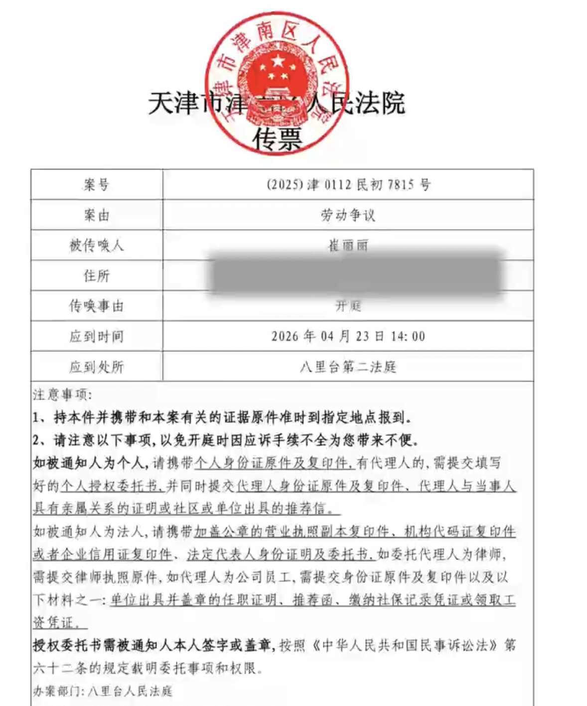 4月21日,全国首例性侵被认定工伤案的当事人崔丽丽有了最新动态。扬子晚报/紫牛新闻记者从当事人崔丽丽处获悉,她的工伤待遇案即劳动争议案一审将于 4月23日下午两点在天津市津南区人民法院的八里台人民法庭开庭审理。据其向记者提供的法院传票显示,该案案由为劳动争议。
