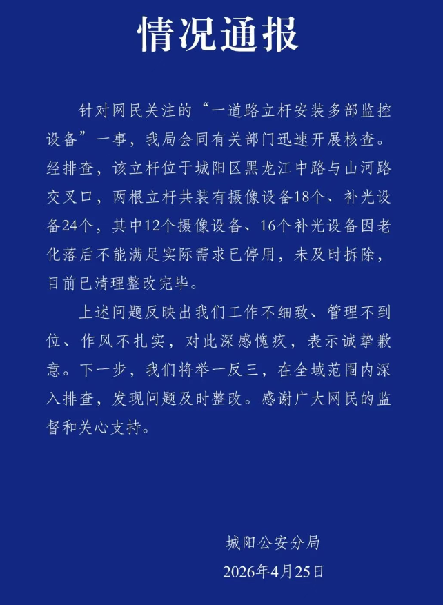 紫牛新闻记者注意到,就在4月25日,青岛市公安局城阳分局对此发布情况通报。通报称,针对网民关注的“一道路立杆安装多部监控设备”一事,我局会同有关部门迅速开展核查。经排查,该立杆位于城阳区黑龙江中路与山河路交叉口,两根立杆共装有摄像设备18个、补光设备24个,其中12个摄像设备、16个补光设备因老化落后不能满足实际需求已停用,未及时拆除,目前已清理整改完毕。