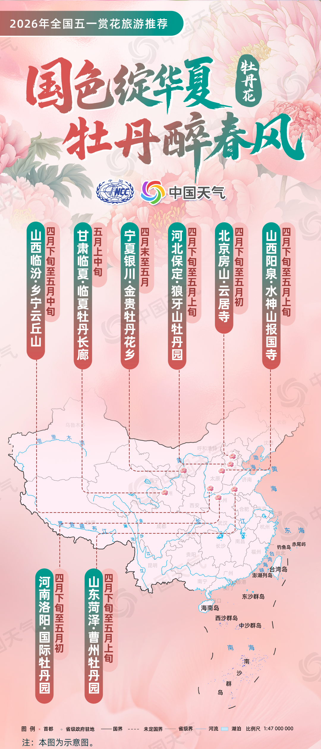 牡丹花:“国色绽华夏・牡丹醉春风”(北京房山云居寺、河北保定狼牙山牡丹园、山西阳泉水神山报国寺、山西临汾乡宁云丘山、山东菏泽曹州牡丹园、河南洛阳国际牡丹园、甘肃临夏牡丹长廊、宁夏银川金贵牡丹花乡);