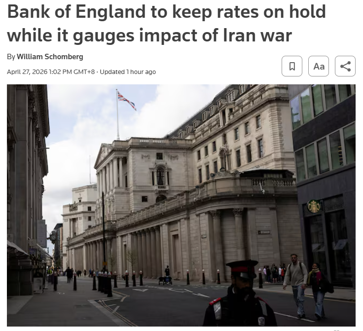 在地缘政治冲突持续升级的背景下,英国央行(英格兰银行)即将迎来关键的货币政策会议。市场普遍预期英国央行将于4月30日维持基准利率不变,同时研判中东局势正对英国经济持续造成的潜在冲击。投资者将密切关注会议结果以及后续新闻发布会,以判断英国央行是否释放出逐步收紧货币政策的信号。