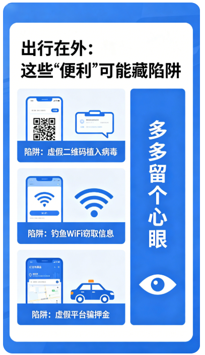 假期出行,扫码、连WiFi、订酒店租车都是高频操作,而这些看似便捷的举动,往往是骗子的突破口,每一步都要多留个心眼!