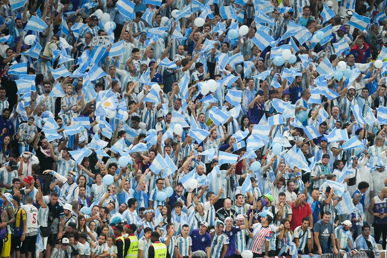 2022年12月18日,阿根廷队球迷在比赛中助威。当日,在卡塔尔卢赛尔球场进行的2022卡塔尔世界杯足球赛决赛中,阿根廷队对阵法国队。新华社记者 肖艺九 摄