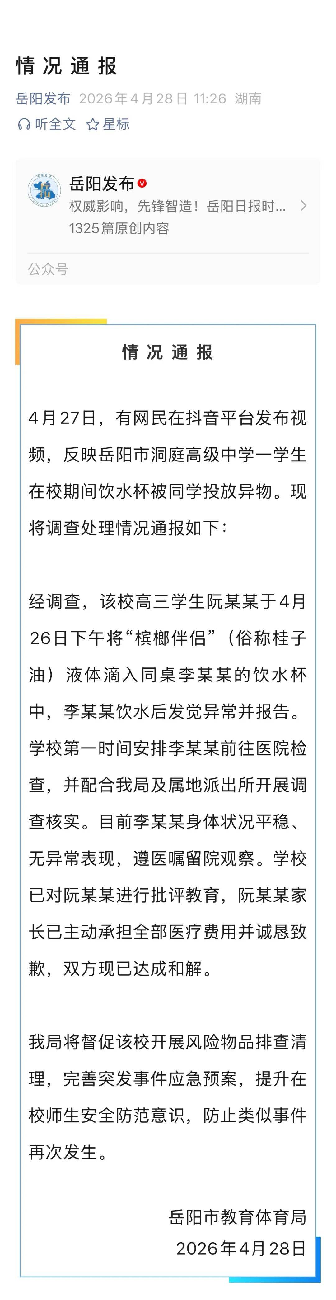 “高中生在校期间饮水杯被同学投放异物”,湖南岳阳通报→