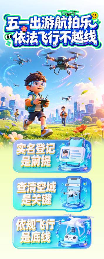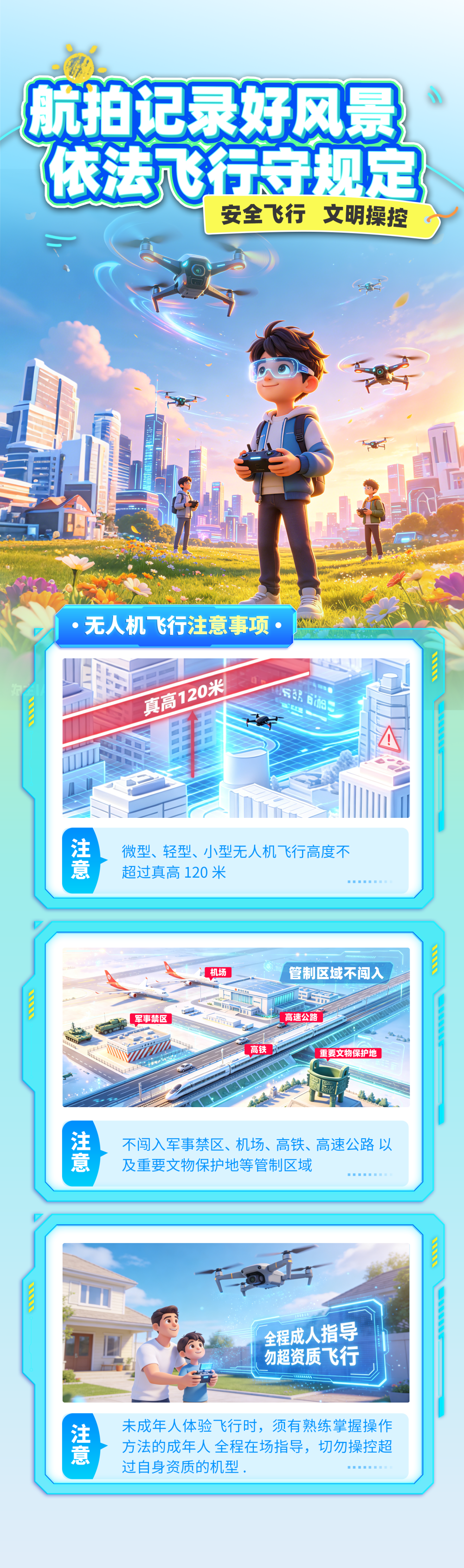 公安机关要求,飞行前务必通过民用无人驾驶航空器综合管理平台(UOM平台)完成实名登记,并查询计划飞行区域的空域属性,确认无人机已完成实名登记且活动在适飞空域内。微型、轻型、小型无人机飞行高度不得超过真高120米,不得闯入军事禁区、机场、高铁、高速公路及重要文物保护地等管制区域。未成年人体验飞行时,须有熟练掌握操作方法的成年人全程在场指导,切勿操控超过自身资质的机型。