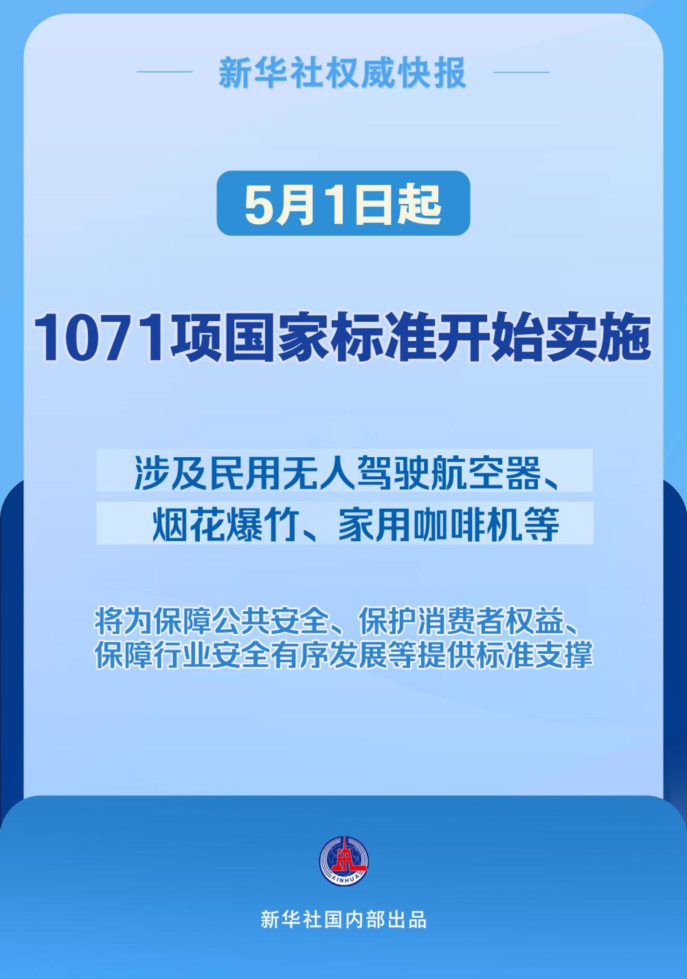 5月1日起,1071项国家标准开始实施,其中包括民用无人驾驶航空器、烟花爆竹、家用咖啡机、鞋长、孤独症儿童康复机构服务质量等重要国家标准。新标准的实施将为保障公共安全、保护消费者权益、保障行业安全有序发展等提供标准支撑。